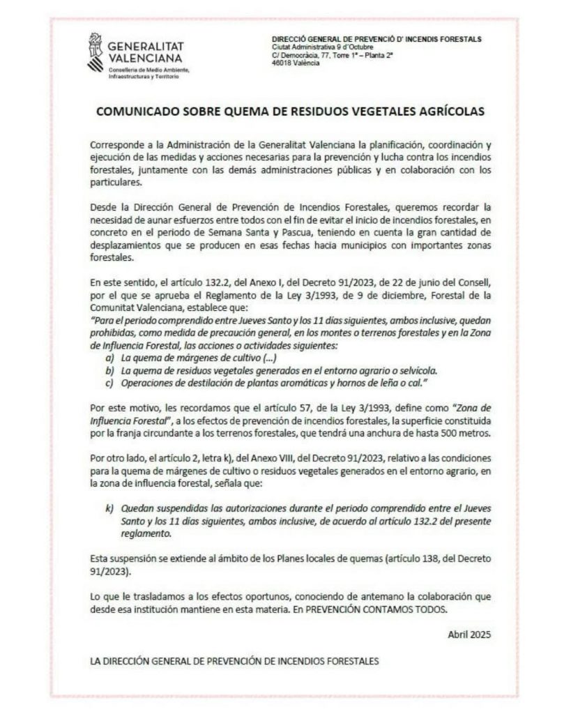 Des de la Direcció General de Prevenció d’Incendis Forestals s’ha emés un comunicat pel qual queden totalment prohibides, des del Dijous Sant i durant els 11 dies següents (els dos inclusivament), les següents activitats:
