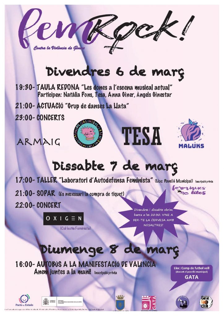 El primer cap de setmana de març, FemRock contra la violència de gènere. La regidoria de la Dona i Igualtat de l’Ajuntament de Gata i el Col·lectiu feminista han sumat esforços i han preparat un complet programa amb xerrades, tallers, concerts, sopar popular…
