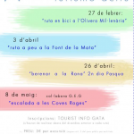 Finalmente, domingo 8 de mayo se cerrará la campaña de Turismo Activo, con una actividad que cuenta con la colaboración de Grupo Espeològic de Gata. Se realizará una Escalada a las Cuevas Rojas, que comenzará a las 10.00 horas y el punto de salida será el ayuntamiento de Gata. La duración será de 3 horas. Y el mínimo de edad para poder hacer la actividad será de 10 años. Hay que llevar: ropa elástica, calzado deportivo, almorzar y agua. Las Inscripciones se harán en la TOURIST INFO GATA y se deberán realizar antes del viernes anterior a cada ruta.
