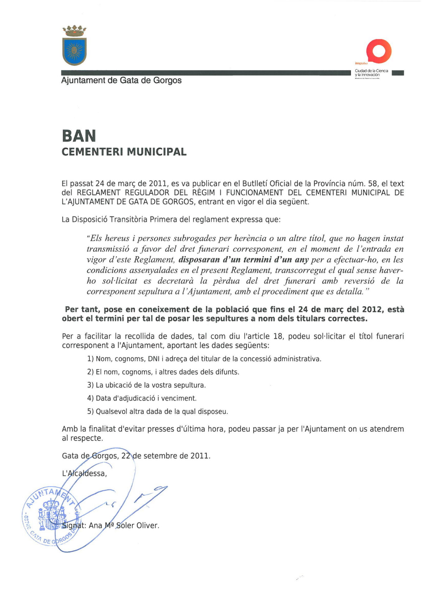Bando Cementerio Queda abierto el plazo para poner las sepulturas a nombre de los titulares correctos. Este terminio finalizará el 24 de Marzo de 2012. Enlaces Descargar Impreso Solicitud
