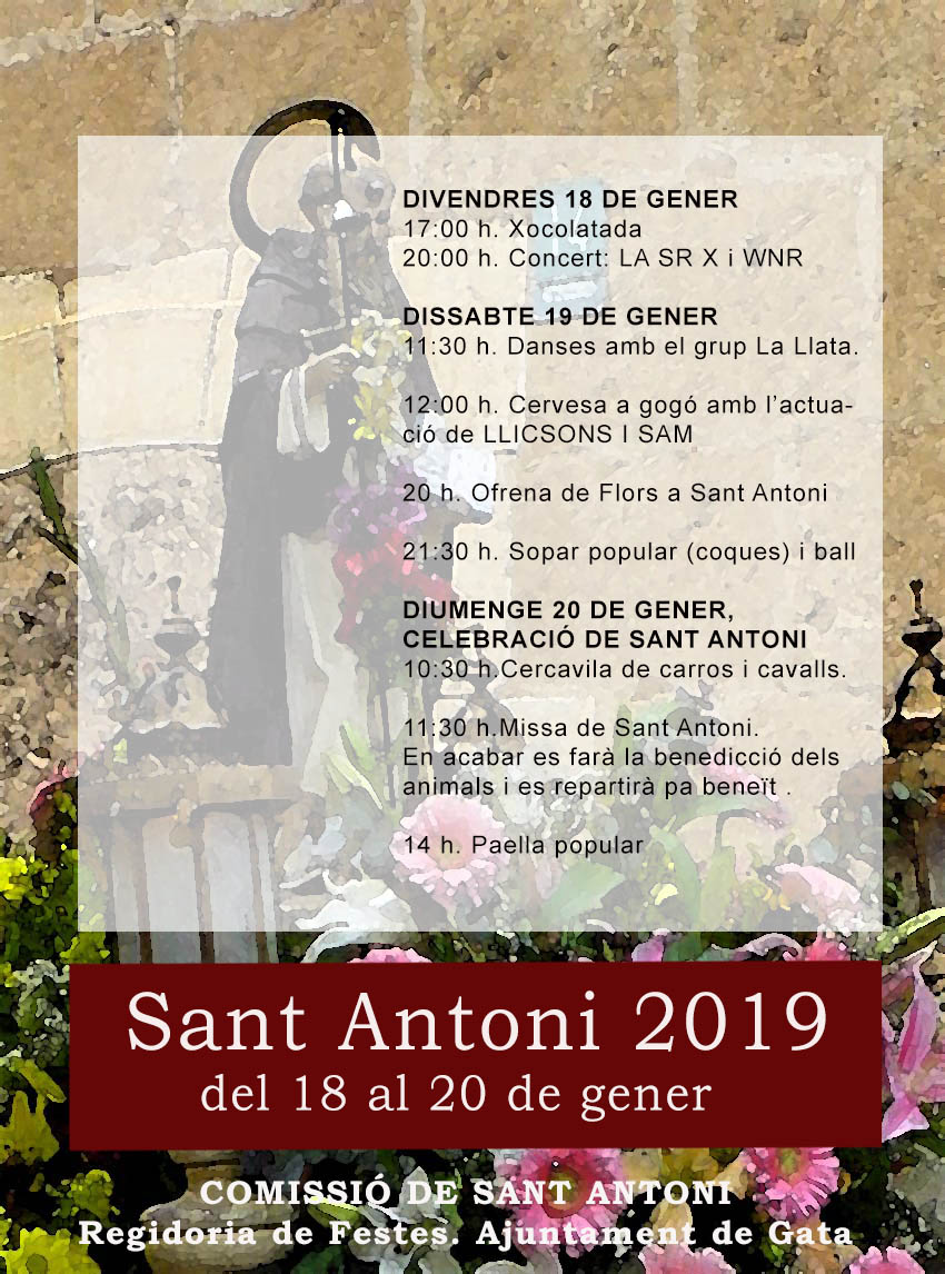 Dissabte 19 de gener, a les 11:30 hores hi haurà una actuació de balls tradicionals a càrrec del grup de danses La Llata de Gata a la placeta de Sant Antoni i en acabar la comissió de Sant Antoni oferirà cervesa a gogó que comptarà amb l’actuació de Llicsons i S.A.M.