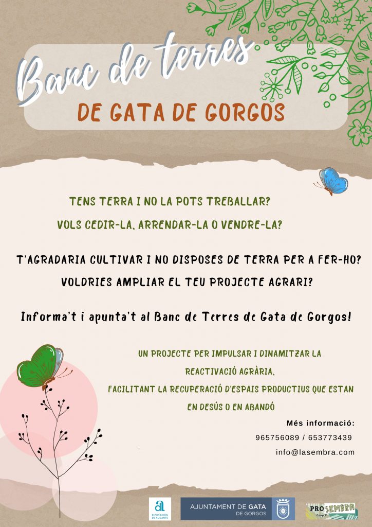 L’Ajuntament de Gata de Gorgos impulsa el Banc de terres local. Alguns dels objectius principals del programa són: incentivar als propietaris de parcel·les que es troben en situació d’abandó o en risc d’abandó, per a posar-les en actiu; evitar la pèrdua de bagatge i tradició cultural que suposa l’abandonament de l’agricultura; augmentar les oportunitats relacionades amb el sector agrari; disminuir el risc d’incendi, la proliferació de plagues i de rosegadors, l’erosió del sòl, la proliferació d’abocaments incontrolats de deixalles, la degradació paisatgística, etc.