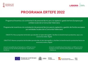 L’Ajuntament de Gata ha contractat dos persones tècniques que es dedicaran a la tramitació dels fons europeus per a la població gràcies a la subvenció ERTEFE 2022, un Programa d’incentius a la contractació de personal tècnic per a la captació i gestió de fons Europeus per a entitats locals de la Comunitat Valenciana de la Conselleria d’Economia Sostenible, Sectors Productius, Comerç i Treball