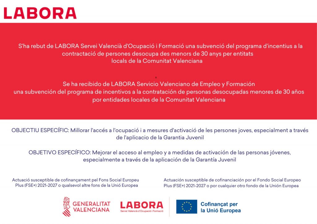 La duració del contracte serà de 10 mesos i a través del programa d’incentius a la contractació de persones desocupades menors de 30 anys per entitats locals de la Comunitat Valenciana (EMPUJU 2024) de Labora Servei Valencià d’Ocupació i Formació.