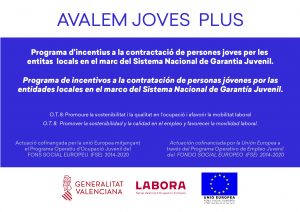 “Pla Avalem Joves Plus, convocatòria EMPUJU 2020» és un programa d’incentius a la contractació de persones joves per entitats locals en el marc del Sistema Nacional de Garantia Juvenil, cofinançat per mitjà de la Iniciativa d’Ocupació Juvenil i el Fons Social Europeu a través del programa Operatiu d’Ocupació Juvenil per al periode 2014-2020 (CCI 2014ES 05M9P001).