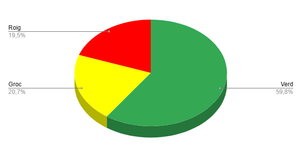 Actualment, l’estat global és clarament positiu, ja que la gran majoria dels compromisos s’han completat: un 59,8% estan classificats com a verds (assolits totalment). El 20,7% dels objectius es troben en fase d’execució (groc), amb accions significatives en marxa per a la seva consecució. Finalment, només el 19,5% es considera roig (compromisos sense iniciar, parats o no viables).